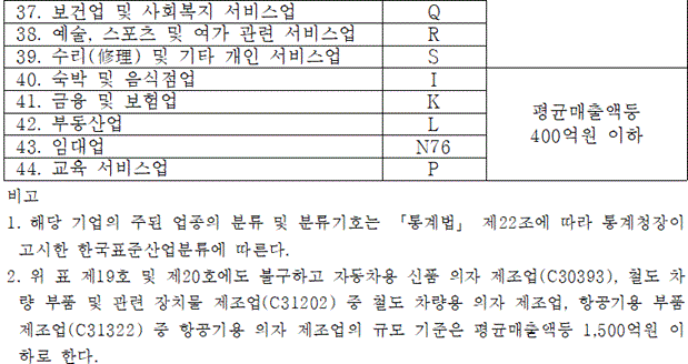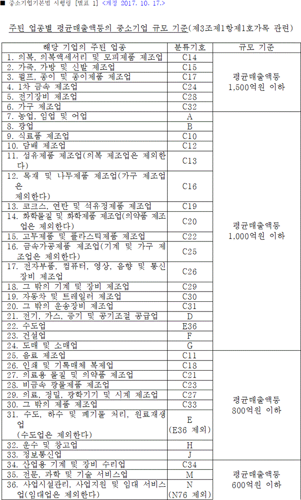 중소기업은 여러가지 요건이 있는데, 각 업종별로 일정 매출액 이하여야 하는 거죠.