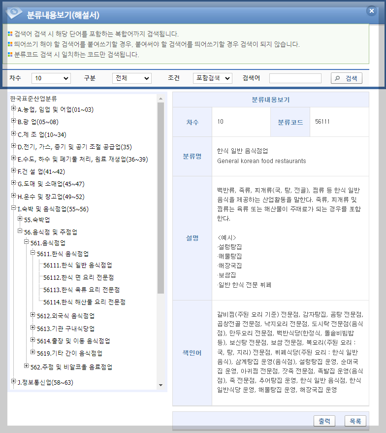 여기서 보자면 5611.한식 음식점업과 5612.외국식 음식점업은 다른 업종으로 새로운 창업에 속하게 됩니다.