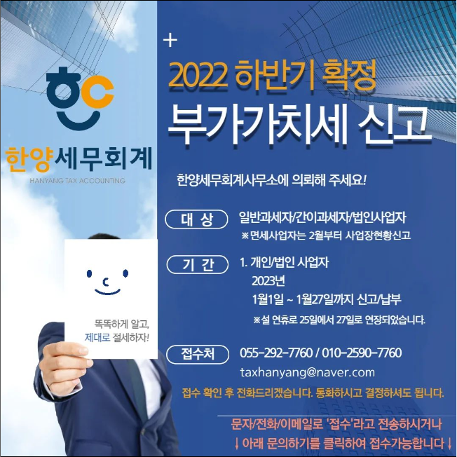 2022년 하반기 확정 부가가치세 신고, 한양세무회계사무소에 의뢰해 주세요!