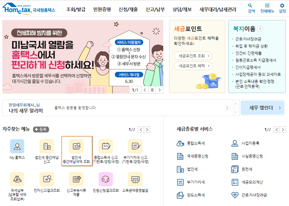 홈택스에 들어가서 "법인세 중간예납세액 조회" 메뉴에서 확인할 수 있습니다.