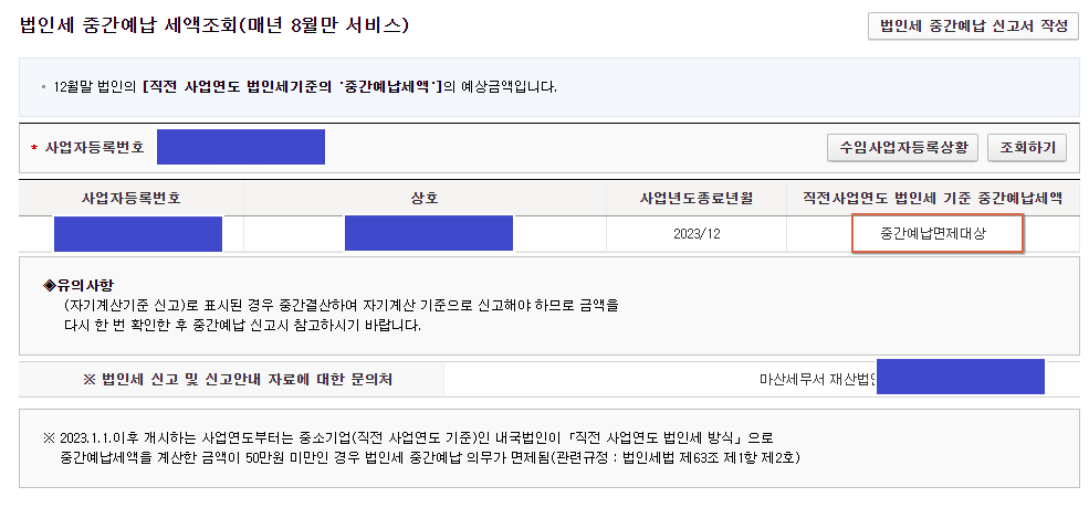 법인세 중간예납 세액조회를 들어가면 이렇게 "중간예납면제대상"인지, 아니면 중간예납세액이 얼마인지 알 수 있습니다.