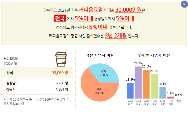 보시면, 커피음료점을 하면서 연매출 3억을 달성하신 사장님들은 상위 5%안에 드시는 분들이네요.
