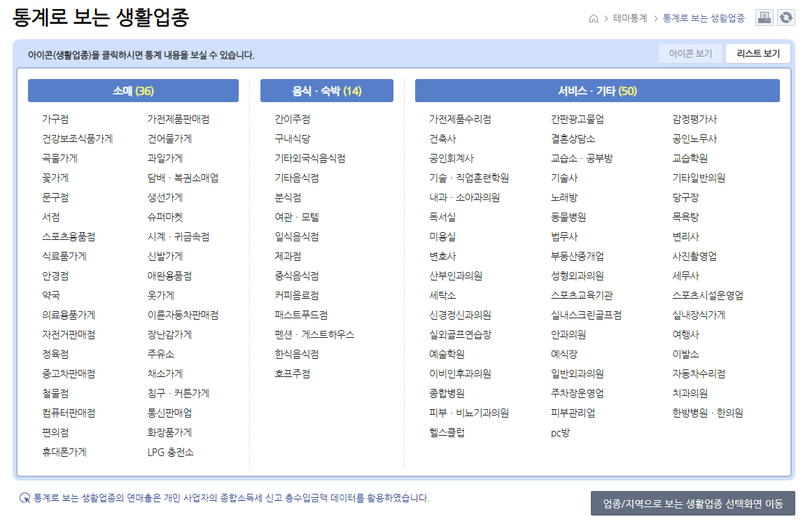 을 들어가시면, 창업전에 꼭 확인해야 할 업종별, 지역별 업종 정보를 확인할 수 있습니다.