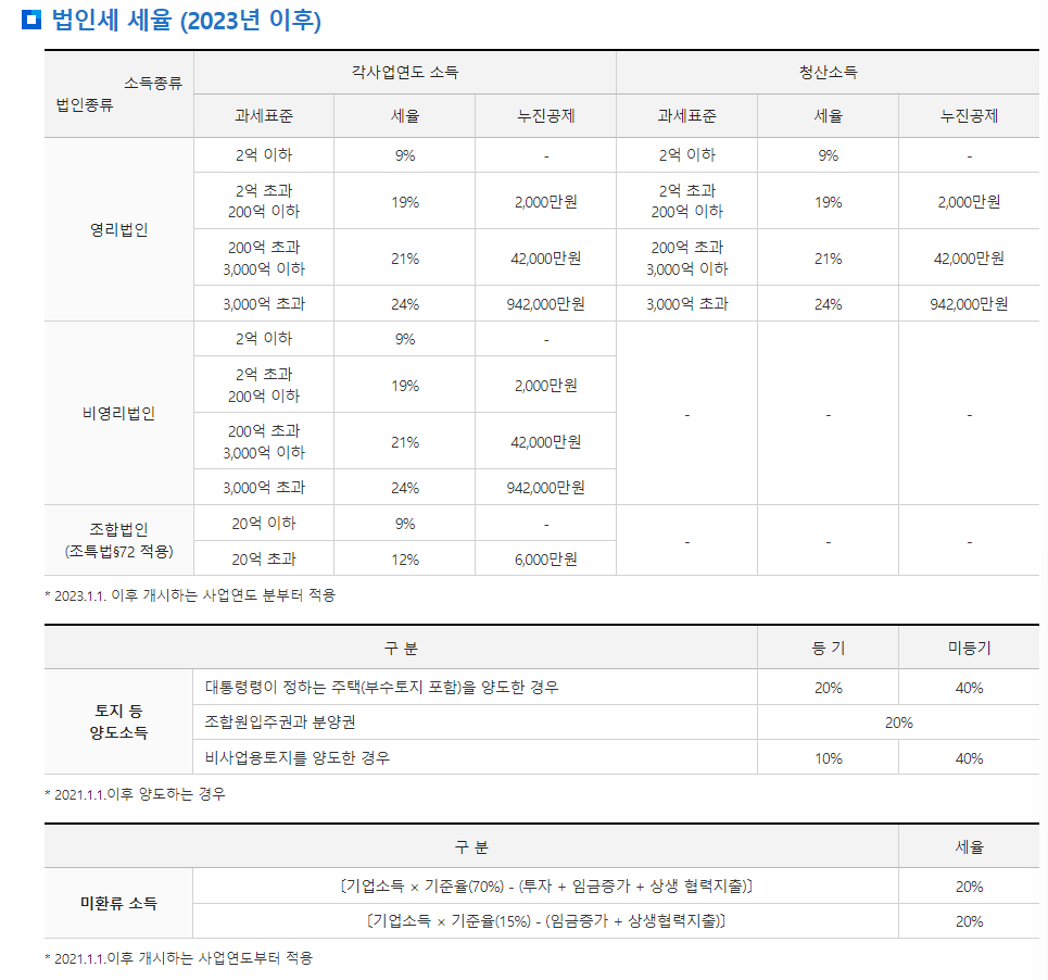 우리나라는 법인세를 각사업연도 소득과 청산소득, 양도소득, 미환류소득 등으로 구분해서 각각의 세율을 정해서 납세하도록 규정하고 있습니다.