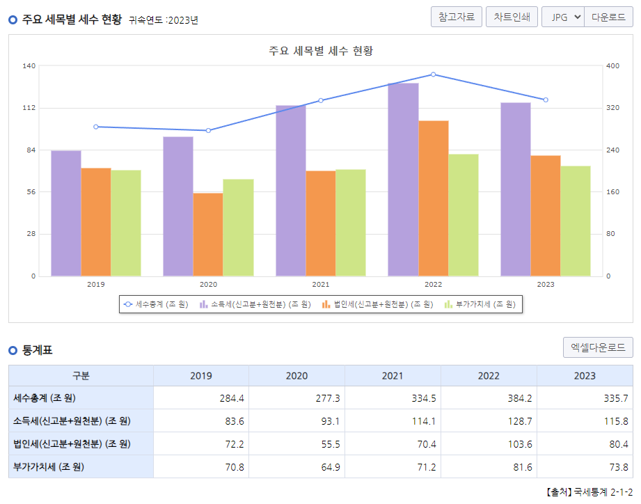 소득세가 가장 높은 세수를 차지하고, 그 다음이 법인세입니다.