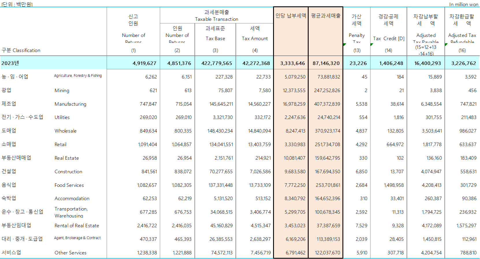 음식점업은 평균 매출은 2억 5천 3백만원, 평균 부가세 납부액은 777만원으로 집계되었습니다. 정확하다고 볼 수 있는게, 음식점업은 2억 5천만원 이하로 매출이 발생하면 사실상 순이익을 3천만원 이하로 가져갈수 있어서 생활이 녹록치 않습니다.
