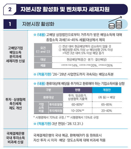| 자본시장 | [신설] 일정 요건*을 충족하는 고배당 기업의 배당소득에 대해 분리과세(세율 14~35%) 적용 | '26~'28년 배당소득분 |