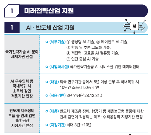 | AI·반도체 | [신설] 국가전략기술에 생성형 AI, 에이전트 AI 등 5개 기술 추가 및 관련 데이터센터 시설을 사업화시설에 포함 | - |