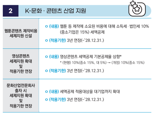 | K-문화·콘텐츠 | [신설] 웹툰 제작비에 대해 10% (중소기업 15%) 세액공제 도입 | '28.12.31.까지 |