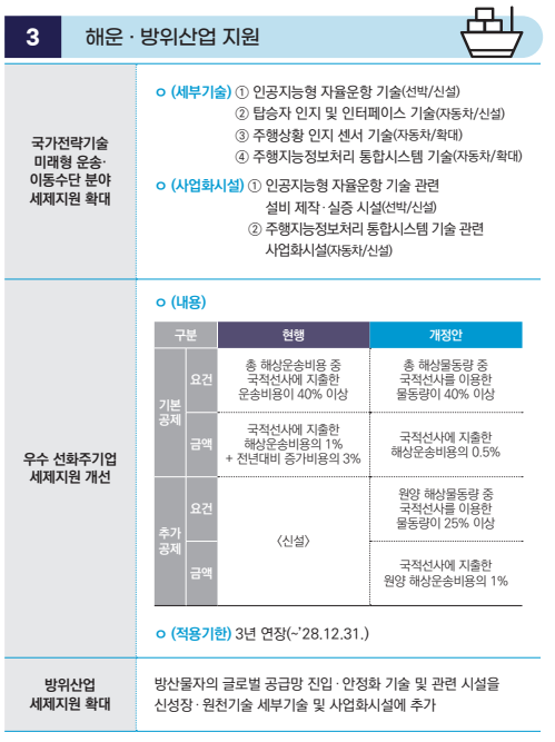 | 해운·방위산업 | 국가전략기술에 인공지능형 자율운항 기술(선박) 등 미래형 운송수단 분야 기술 추가 | - |