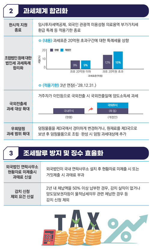 - 조합법인 과세특례: 과세표준 20억원 초과분에 대한 특례세율을 12%에서 15%로 상향합니다.