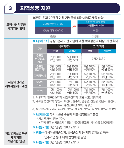 - 지방 경제산업 특구: 아시아문화중심도시, 금융중심지 등 특구 입주기업에 대한 법인세 감면을 3년 연장합니다. (~'28.12.31.)
