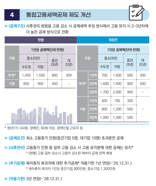 - 공제 방식 변경: 고용 감소 시 공제액을 추징하는 방식에서, 고용을 유지하면 2~3년차에 더 높은 공제액을 지원하는 방식으로 전환됩니다.