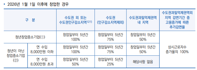 | 청년 창업 (수도권 외) | 최초 5년간 | 100% 감면 |