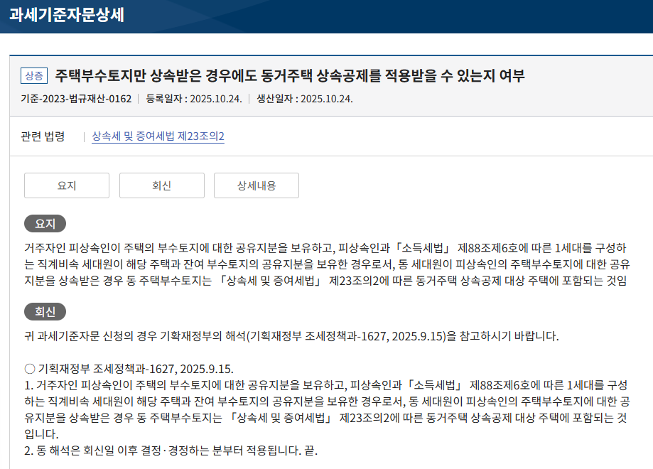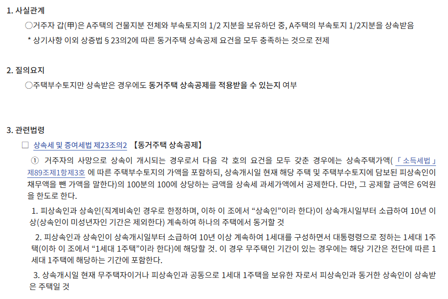 비록 피상속인이 토지 지분만 가지고 있었더라도, 이 토지 지분 역시 '동거주택'의 일부로 보아 공제 혜택을 적용받을 수 있게 된 것입니다.