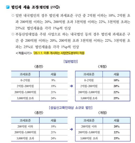 이번 개정안의 핵심은 모든 과세표준 구간에서 법인세율이 각각 1%p씩 인상된다는 점입니다.