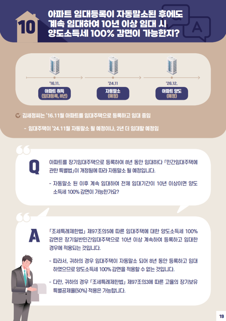 아파트 임대등록이 자동말소된 후에도 계속 임대하여 10년 이상 임대시 양도소득세 100% 감면이 가능한지?