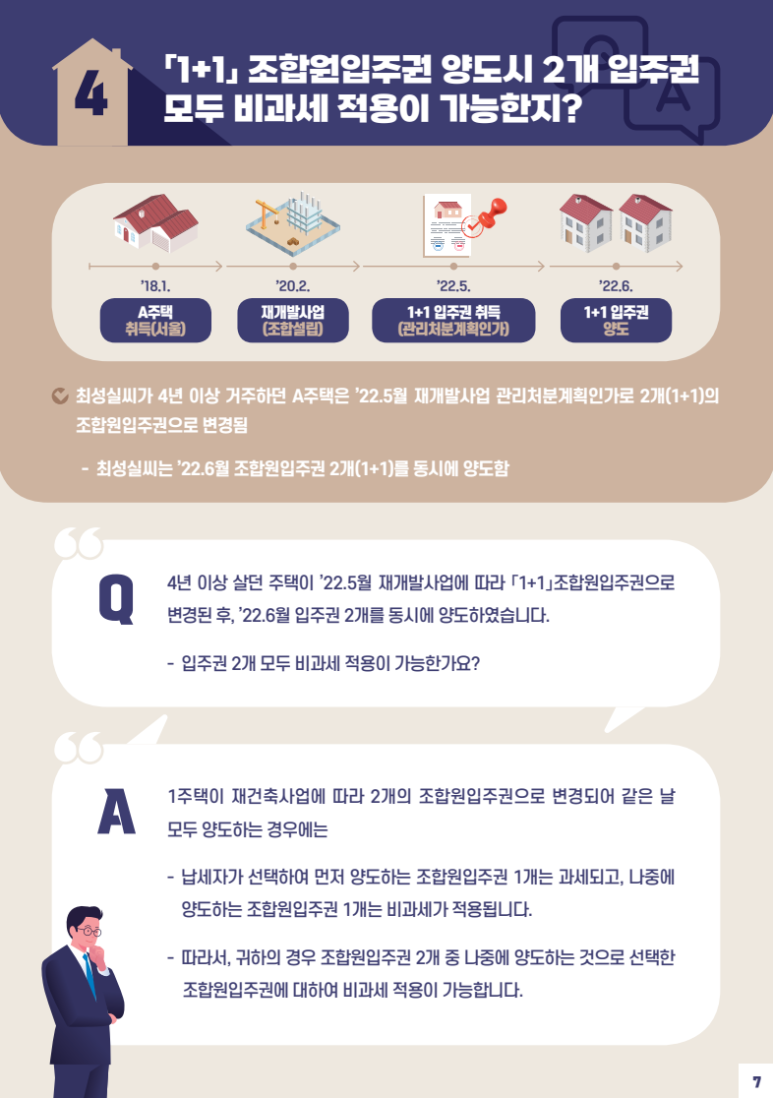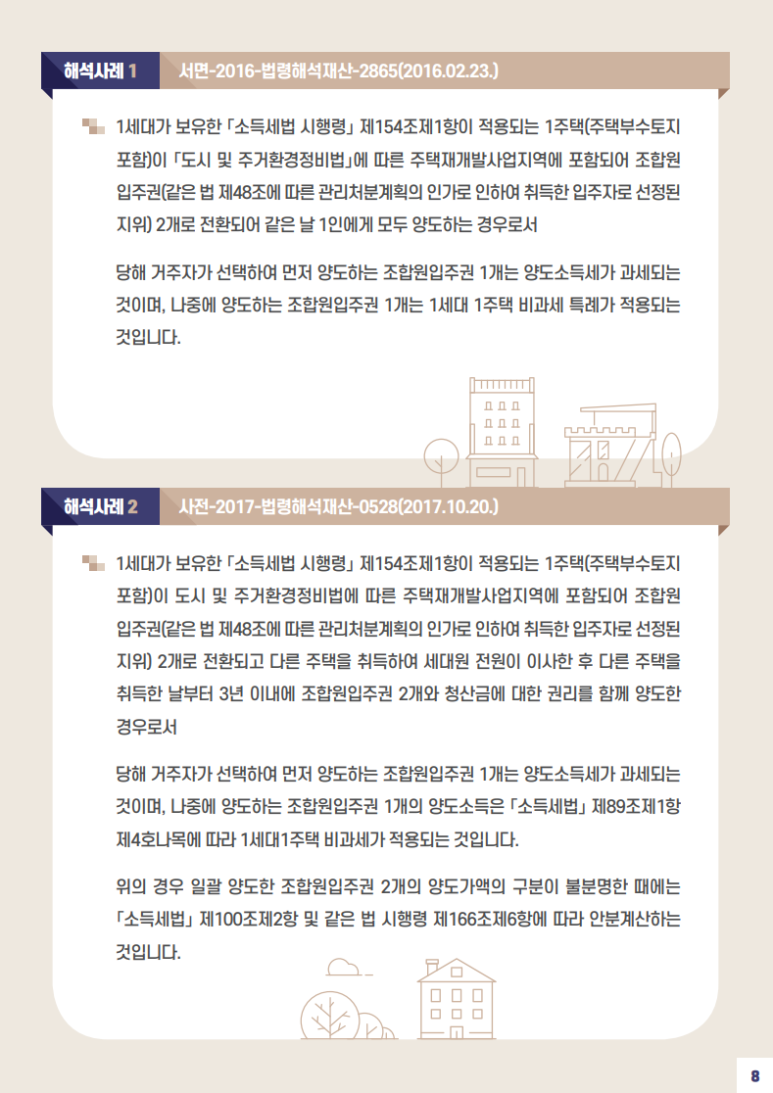 납세자가 선택하여 먼저 양도하는 조합원입주권 1개는 과세되고, 나중에 양도하는 조합원입주권 1개는 비과세가 적용됩니다.