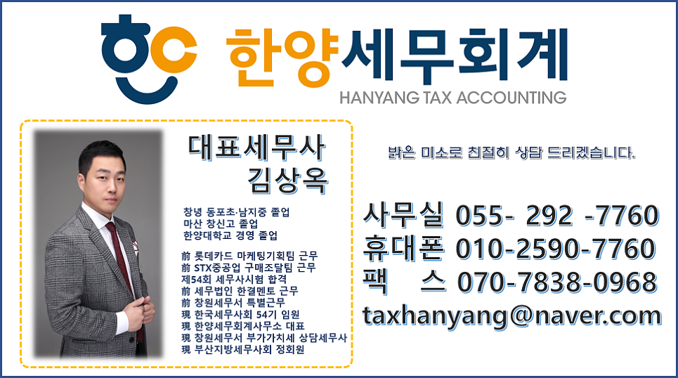 창원시 팔용동에 위치한 한양세무회계사무소는 김상옥 세무사가 운영하고 있는 젊고 활력있는 세무회계 사무소입니다. 납세자의 권리를 보호한다는 신념하에 양도,상속,증여 / 기장대리 / 신고
